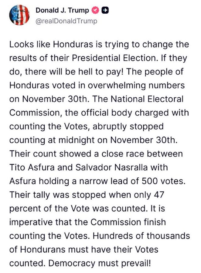 Trump: Honduras Stopped Counting The Votes Like Atlanta In 2020. Not Acceptable!